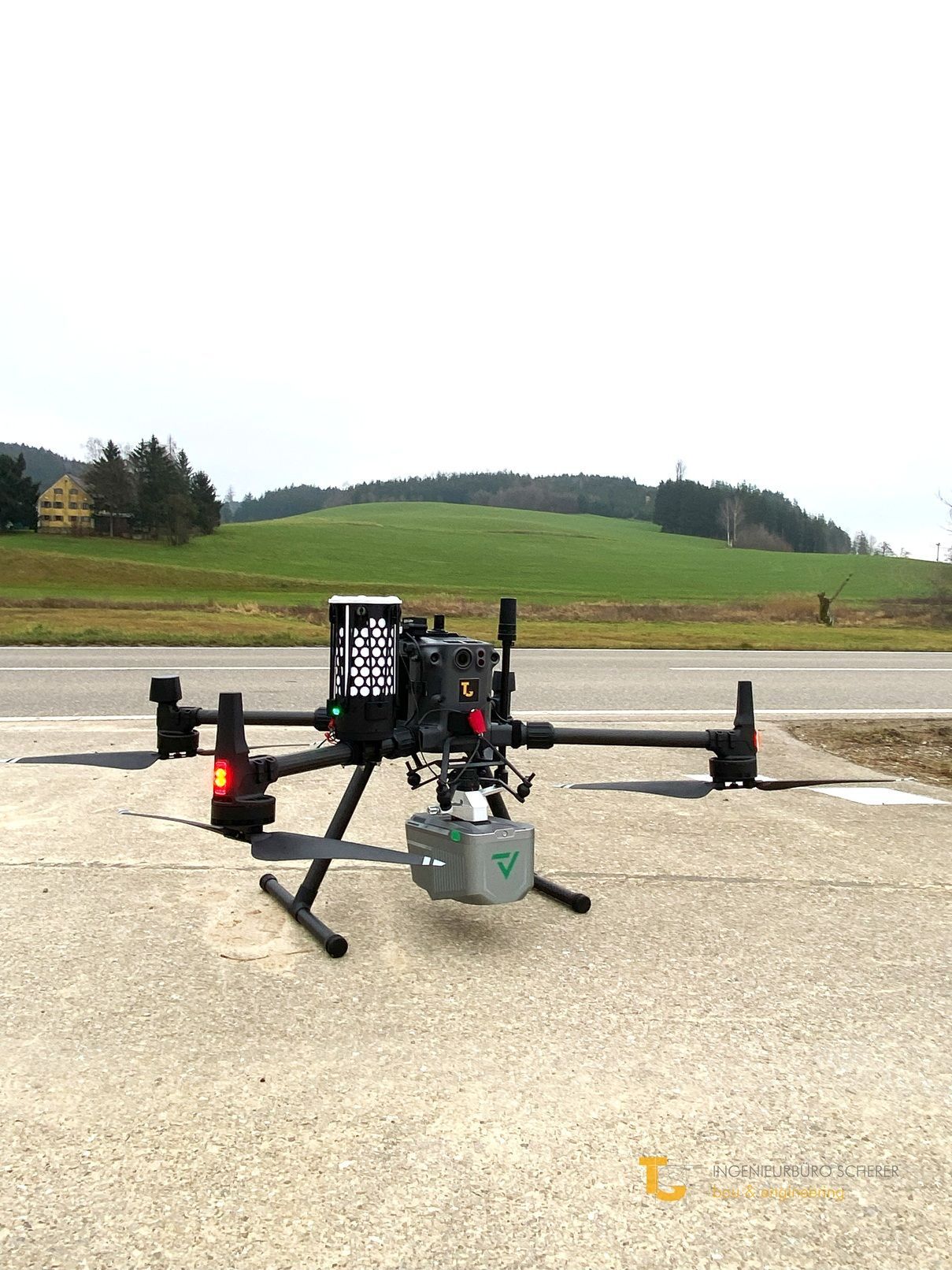 Für die Befliegung kam eine DJI Matrice 300 RTK Drohne in Kombination mit dem TrueView 540 LiDAR-System zum Einsatz. Dieses System vereint Laserscanner, GNSS- und IMU-Sensoren und liefert hochpräzise Punktwolken, die direkt für Bau- und Projektplanungen genutzt werden können.