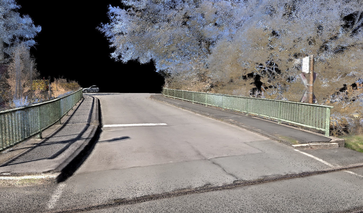 Mit einem mobilen SLAM-System lässt sich die gesamte Umgebung zu Fuß oder mit einem tragbaren Scanner erfassen. Die LiDAR-Sensoren generieren eine dichte Punktwolke der Brücke, während GNSS die absolute Lage im Koordinatensystem fixiert. So entsteht ein vollständiges Abbild – von den Fahrbahnbelägen bis zu den Geländerstrukturen.